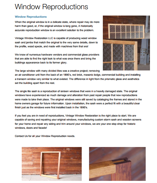 The pictures were separated by Residential and Commercial work. From there they were further separated into Window and Wood services. And then finally we further separated into Preservation, Restoration and other services. After all this, we then created files that had Location-specific photos. Once completed, Vintage Window Restorations really shined by simply organizing the photos as shown here, and articulating about the specific service they provide as well as providing a thorough overview for the pictures. These write ups become a fantastic representation for future clients as well as for the Search Engines to rank them.